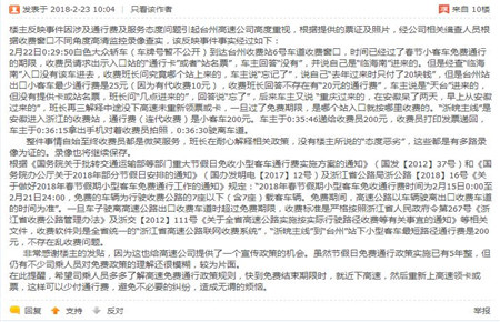 集團(tuán)對(duì)此事件高度重視,當(dāng)即調(diào)取當(dāng)時(shí)多路監(jiān)控錄像,還原了事件真相。2月22日凌晨0:29:50,投訴人駕駛小轎車進(jìn)入臺(tái)州所6號(hào)車道,時(shí)間已經(jīng)過(guò)了春節(jié)小客車免費(fèi)通行的期限,收費(fèi)員黃智超請(qǐng)求出示入口站的通行卡或者紙質(zhì)繳費(fèi)憑證,車主回答無(wú)卡無(wú)票,聲稱自己是從臨海南上進(jìn)入高速。經(jīng)查證,臨海南并沒(méi)有該車的入口信息。收費(fèi)班長(zhǎng)再次詢問(wèn)時(shí),車主說(shuō)“忘記了”,說(shuō)自己“去年過(guò)來(lái)時(shí)只付了20塊錢(qián)”,但是臺(tái)州站出口小客車最少通行費(fèi)是25元(因?yàn)橛写召M(fèi)10元),收費(fèi)班長(zhǎng)回答不存在有“20元的通行費(fèi)”,司機(jī)忽而改口說(shuō)是天臺(tái)進(jìn)入的,忽而想了一下又說(shuō)是重慶過(guò)來(lái)的,在安徽呆了兩天,當(dāng)天早上從安徽上的高速。班長(zhǎng)再三解釋中途沒(méi)下高速未重新領(lǐng)票或卡,一旦過(guò)了免費(fèi)期限,是哪個(gè)站入口就按哪里收費(fèi)的。“浙皖主線”是安徽進(jìn)入浙江的收費(fèi)站,通行費(fèi)(連代收費(fèi))是小客車200元。車主于0:35:46遞給收費(fèi)員200元,收費(fèi)員打印發(fā)票遞回,車主于0:36:15拿出手機(jī)對(duì)著收費(fèi)員拍照,0:36:30駛離車道。