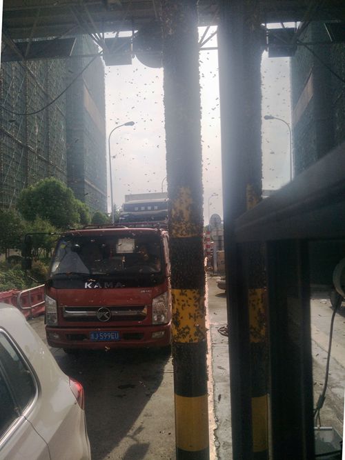 圖為蜜蜂集聚在收費(fèi)站 原來這輛綠通車運(yùn)輸蜂箱,由于蜂箱沒有關(guān)閉嚴(yán)實(shí),在車通過車道檢查稍作停留時,大量的蜜蜂乘機(jī)逃出,圍攻收費(fèi)崗?fù)ぃ炜账查g一片密密麻麻。它們有的停留在車道的防撞柱上,有的在收費(fèi)窗口附近盤旋,遲遲不肯離開,嚇得過收費(fèi)站等待繳費(fèi)的司機(jī)不敢開車窗繳費(fèi)。
