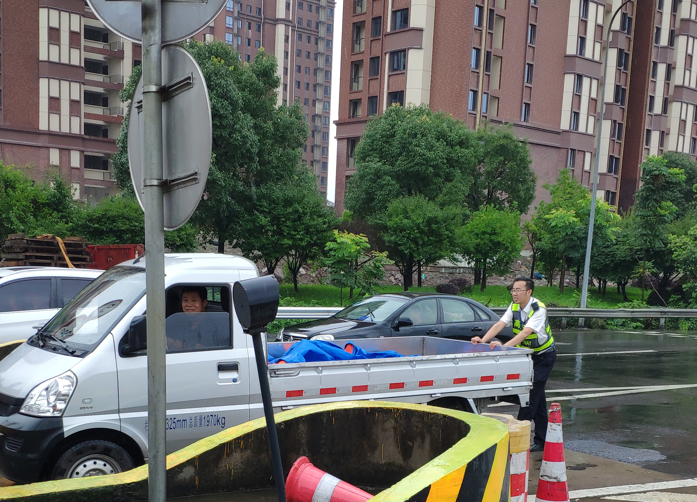 車輛故障拋錨 收費員冒雨推行 7月4日中午12時30分左右,一輛牌照為浙開頭的五菱小貨車停在臺州收費所出口5號車道安全島邊上許久未動,來往車輛紛紛避開該車道。當班班長郭斯泓發現這一情況后立即上前詢問,并在該車后放置隔離桶,提醒駕駛員打開雙閃燈。