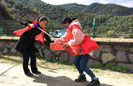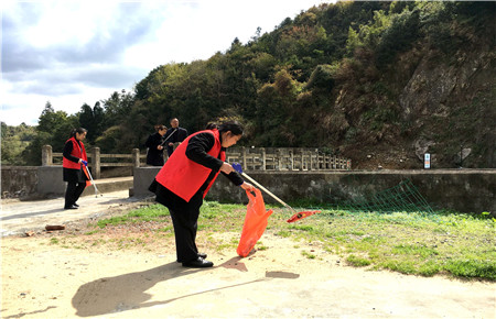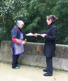 圖為女職工向當(dāng)?shù)乩先诵麄髑迕魑拿骷罀?/span> 然而,女職工們卻不“安分守己”,以這樣的方式來(lái)慶祝自己的節(jié)日:她們兵分二路,一路擔(dān)起森林防火宣傳員,向過(guò)往群眾發(fā)放《清明文明祭掃和森林防火倡議書(shū)》,并對(duì)上了年紀(jì)的村民耐心講解倡議書(shū)內(nèi)容,將臺(tái)州高速的文明服務(wù)從工作中延伸到了生活中。一路環(huán)繞水庫(kù)去清理其邊上的垃圾,一上午下來(lái),收獲還真不少,共清理廢紙、飲料罐、塑料袋等廢棄物若干袋,在打造“生態(tài)文明”中率先垂范,擔(dān)其責(zé),盡其力。