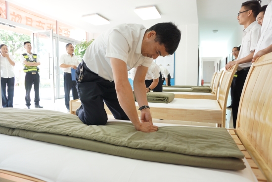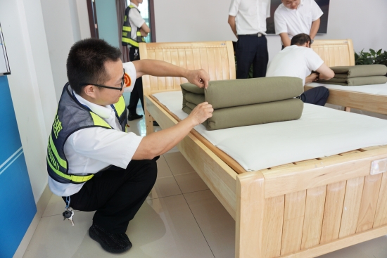 圖為比賽現(xiàn)場(chǎng) 活動(dòng)現(xiàn)場(chǎng),裁判宣布比賽規(guī)則及打分標(biāo)準(zhǔn):評(píng)分從被子整體形狀、平整度、棱角明顯、折疊時(shí)間等方面判斷,規(guī)定在5分鐘內(nèi)完成,共設(shè)置一、二、三等獎(jiǎng)三個(gè)獎(jiǎng)項(xiàng)。內(nèi)務(wù)半軍事化在該所已是常態(tài),參賽選手們很快進(jìn)入狀態(tài),從鋪到疊再到整,駕輕就熟,均能在規(guī)定時(shí)間內(nèi)整出“豆腐塊”。評(píng)委現(xiàn)場(chǎng)進(jìn)行點(diǎn)評(píng)和打分。經(jīng)過(guò)競(jìng)逐,最后副站收費(fèi)四班何翊平奪得一等獎(jiǎng)。比賽分四輪進(jìn)行,且全程用時(shí)不到1個(gè)小時(shí)。