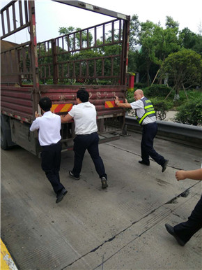 2018年5月27日,這本來是平凡普通的一天,可因為這件事,變成了不一樣的一天。 這一天,溫嶺西高速路收費員洪燈杰像往常一樣,在一號超寬車道旁的收費亭里工作。一輛綠色汽車剛走不久,卻發(fā)現(xiàn)后面一輛12軸型的小貨車停在那里,一動不動。洪燈杰心生疑惑,于是趕緊走出收費亭,到小貨車跟前查看。原來,這輛車剛走到收費站面前,便耗盡了電量,發(fā)動不了了。正在司機(jī)焦頭爛額之時,班長湯明漲和其他收費員吃飯回來,看見了這一幕。 湯明漲簡單地詢問了洪燈杰事情的經(jīng)過,本來準(zhǔn)備等拖車,可是現(xiàn)在正是中午車輛高峰期,加上五號車道在施工,等拖車不合適。如果導(dǎo)致一號車道堵車,切換成ETC也緩解不了??紤]到這些問題之后,湯班長決定叫來幾個“大力士”,幫忙推車。