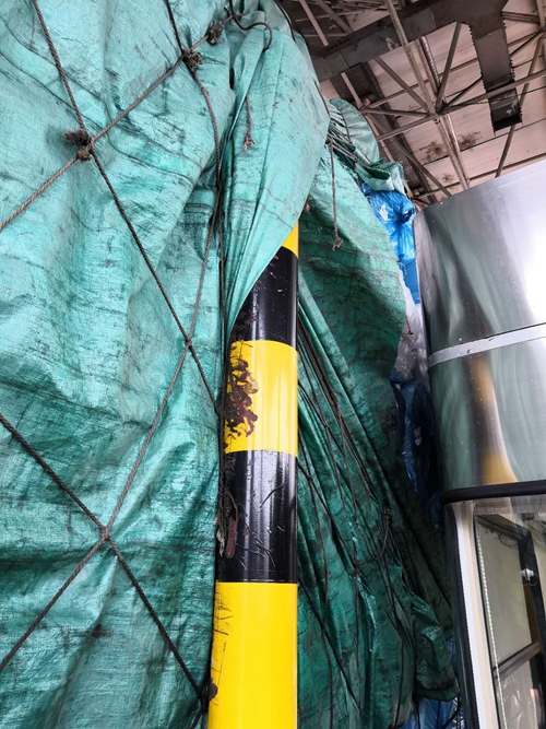圖為篷布纏繞防撞柱 在與司機溝通后,工作人員用剪刀剪開篷布及尼龍網,司機和陳軍用工具頂住貨物防止貨物墜落。經過近20分鐘的努力,終于將篷布與防撞柱分離。 在此,筆者提醒各位貨車司機,出發前一定要仔細檢查車上綁扎物是否扎緊,避免因自身疏忽造成不必要的損失。 洪燈杰