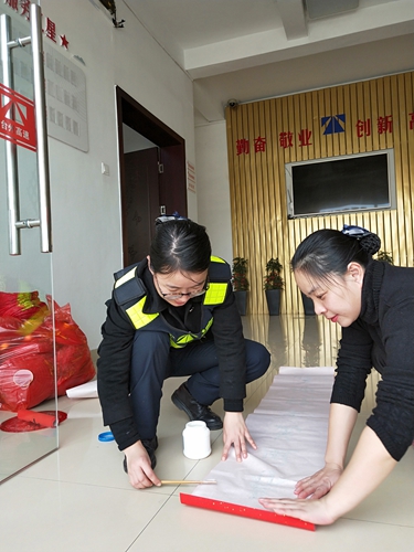 圖為工作人員為營造春節氣氛分工合作 此外,大家在收費所宿舍區、辦公樓、收費區域等地方貼“福”字、貼對聯、掛燈籠、插彩旗,以大紅或金黃色為主色調,充分烘托出收費所“祥和、喜慶、歡快”的節日氛圍。
