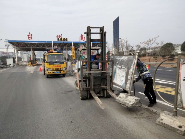 零費用清除沉重的廣告式隔離帶 “副站匝道外的廣告式隔離帶能不能幫忙清除下?” 在接到臺州南收費所的“求助”電話后,施救中心負責人馬上發動人員,迅速聯系了外協單位-----臺州市路橋通遠車輛施救有限公司,開動鏟車奔赴現場。 據悉,臺州南副站匝道廣告式隔離帶比較長,而且有損壞,不美觀而影響站所形象,需要全部更換成水馬。但是其底部的水泥墩非常沉重,人力不能搬動,所以該所希望施救中心幫忙清除這些廢舊物。