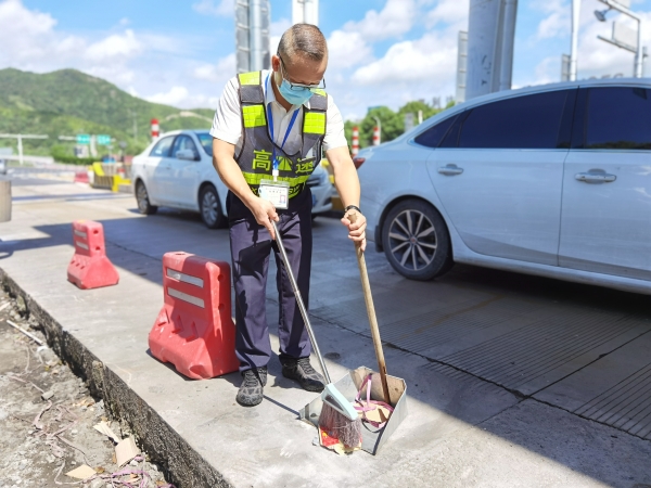 烈日灼燒著大地,高速兩邊的樹葉都被曬得打了卷,悶熱的空氣讓人喘不過氣來,在溫嶺西收費站,不少司乘人員在站時,隨手將食品的塑料袋、煙頭、塑料瓶等垃圾丟棄在收費站出口處,班長陳軍見到隨時清掃路面,保持收費區域衛生干凈整潔。彎腰、清掃、起運,看似簡單的一組動作,陳軍每天要重復幾十次,衣服一天不知要被汗濕多少遍,但他堅持以良好的形象展示臺州高速的精神風貌。他就是臺州高速上的最美堅守者。