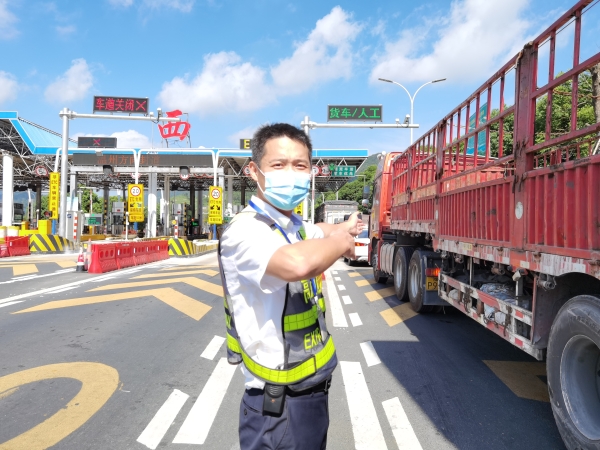 “師傅,慢點,注意后方來車,往左一點。”溫嶺西收費站入口處,一位身高一米七五左右的男同志正在維護著交通秩序。他就是征費三班班長李寧。酷暑高溫無法消磨他的斗志,揮汗如雨對他而言已是家常便飯。溫嶺西收費站車流量大,貨車多,當遇到三超車輛或者節假日的時候,入口處就會排成長龍。七八月份的太陽十分毒辣,經過一天的高溫,收費站入口的馬路上熱浪滾滾,人站在外面不到5分鐘就汗流浹背。但為保持入口交通的安全暢通李寧不斷做著各種不同的手勢,指揮著過往的車輛通行,絲毫顧不得擦拭順著臉頰流下來的汗水。他就是臺州高速上的最美堅守者。